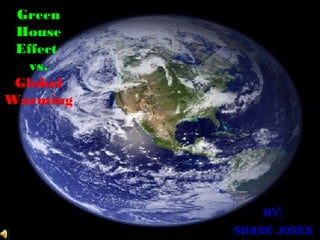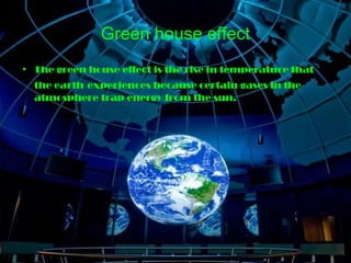The document discusses the greenhouse effect and global warming. The greenhouse effect refers to gases in the atmosphere that trap heat from the sun, causing the Earth's temperature to rise. Global warming is an increase in the Earth's average temperature that results from the greenhouse effect. Some causes of the greenhouse effect and global warming are deforestation, emissions of gases like carbon dioxide and methane, and releases of carbon dioxide from human activities like burning fossil fuels. Consequences of the greenhouse effect and global warming include extreme weather, sea level rise, and impacts on ecosystems and human health and economies. The document provides suggestions for preventing global warming such as reducing energy use and choosing renewable energy sources.