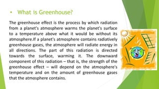 The greenhouse effect is the natural process by which a planet's atmosphere warms its surface through the absorption and reflection of solar energy by greenhouse gases. This phenomenon, first articulated by scientists in the 19th century, significantly influences global temperature change and climate patterns, causing various effects such as rising sea levels and altered weather conditions. Mitigating greenhouse gas emissions can be achieved through practices like recycling, energy conservation, and planting trees.