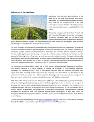 The document discusses the history and benefits of greenhouses in agriculture, emphasizing their role in protecting crops from adverse weather conditions and increasing yields through innovative farming techniques. It highlights the Indian government's support for greenhouse construction through subsidies and mentions the challenges of soil pathogens and the effectiveness of silver hydrogen peroxide for soil disinfection. Furthermore, it points out the increasing necessity for sustainable agricultural practices due to rising costs and environmental concerns.
