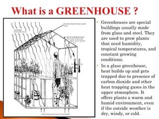 Greenhouses are structures designed to create optimal conditions for plant growth by trapping heat, primarily through greenhouse gases like water vapor, carbon dioxide, methane, and nitrous oxide. Human activities have increased greenhouse gas concentrations, leading to global warming, which causes extreme weather patterns, rising sea levels, and threats to biodiversity and food security. Adaptation and mitigation efforts are essential to address the adverse effects of climate change on human and ecological systems.