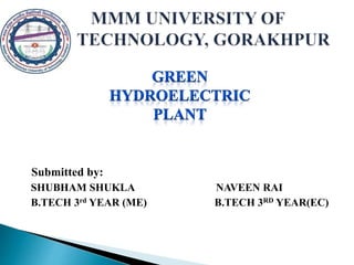 This document discusses hydroelectric power plants and their environmental impacts. It begins by introducing hydroelectric power and listing its key components. It then outlines several advantages of hydroelectric power, such as low production costs and flood control. However, it also examines environmental problems caused by hydroelectric dams, such as greenhouse gas emissions, impacts on aquatic animals, declining water quality, and sedimentation in reservoirs. The document proposes solutions to these issues and discusses new hydroelectric technologies that do not require dams. It concludes by emphasizing the importance of transitioning to green technologies while also addressing their potential negative effects.