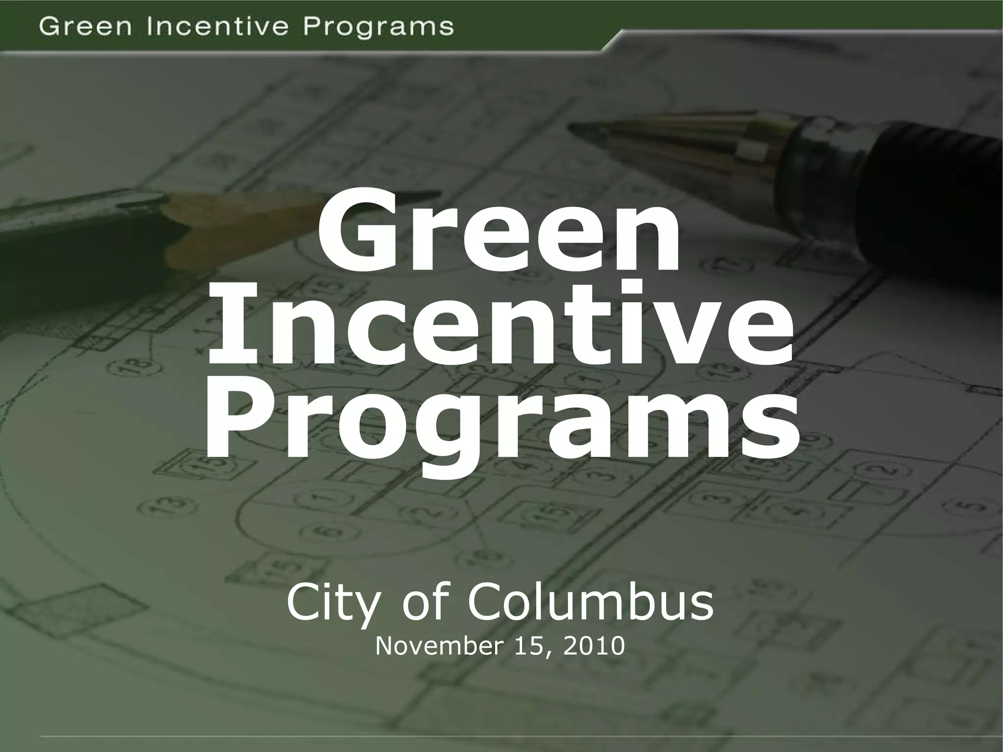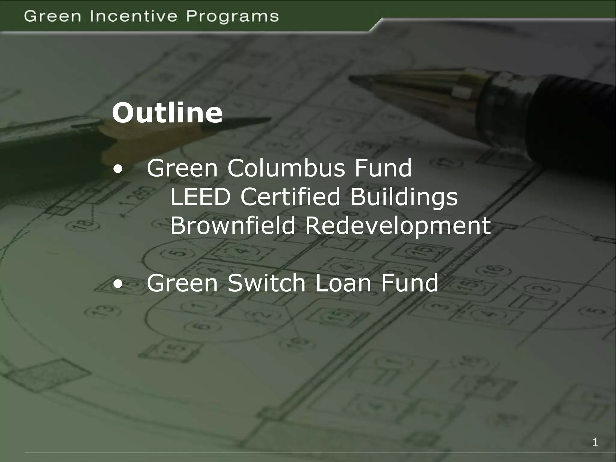 The document outlines the Green Columbus Fund and Green Switch Loan Fund programs aimed at promoting energy efficiency and supporting LEED certified buildings in Columbus. The Green Columbus Fund offers a $1 million reimbursement grant targeting private and non-profit sectors for building certification and brownfield redevelopment, while the Green Switch Loan Fund provides loans of up to $200,000 for energy efficiency improvements. Both programs are part of Columbus's strategy to enhance economic development and environmental goals.