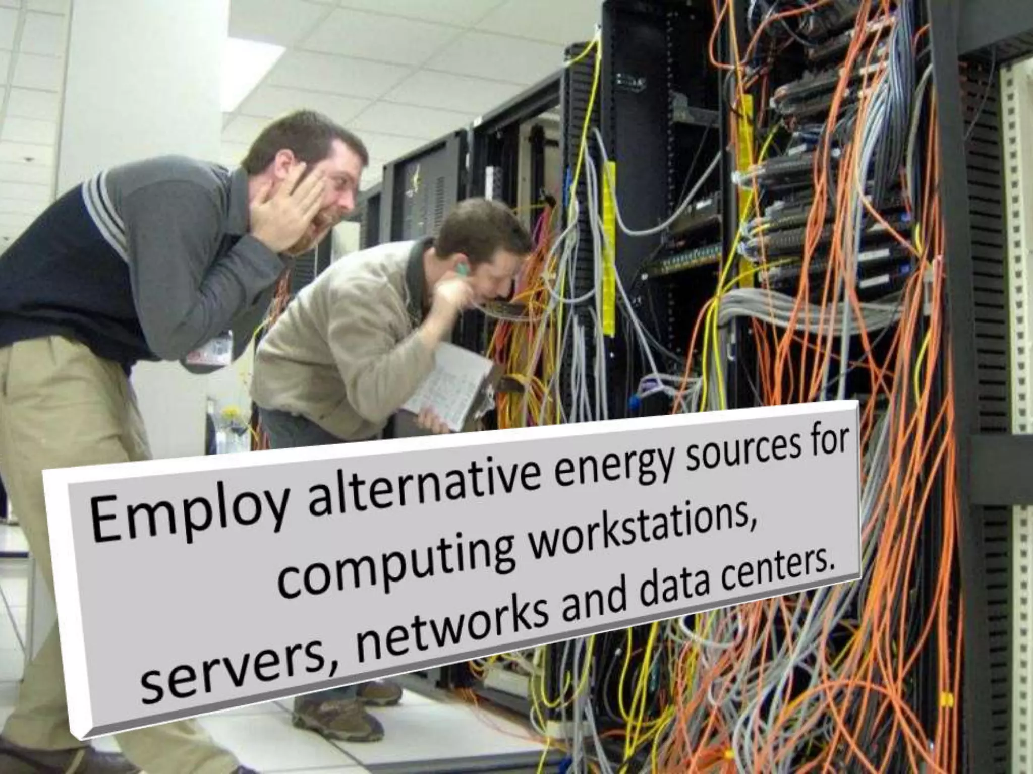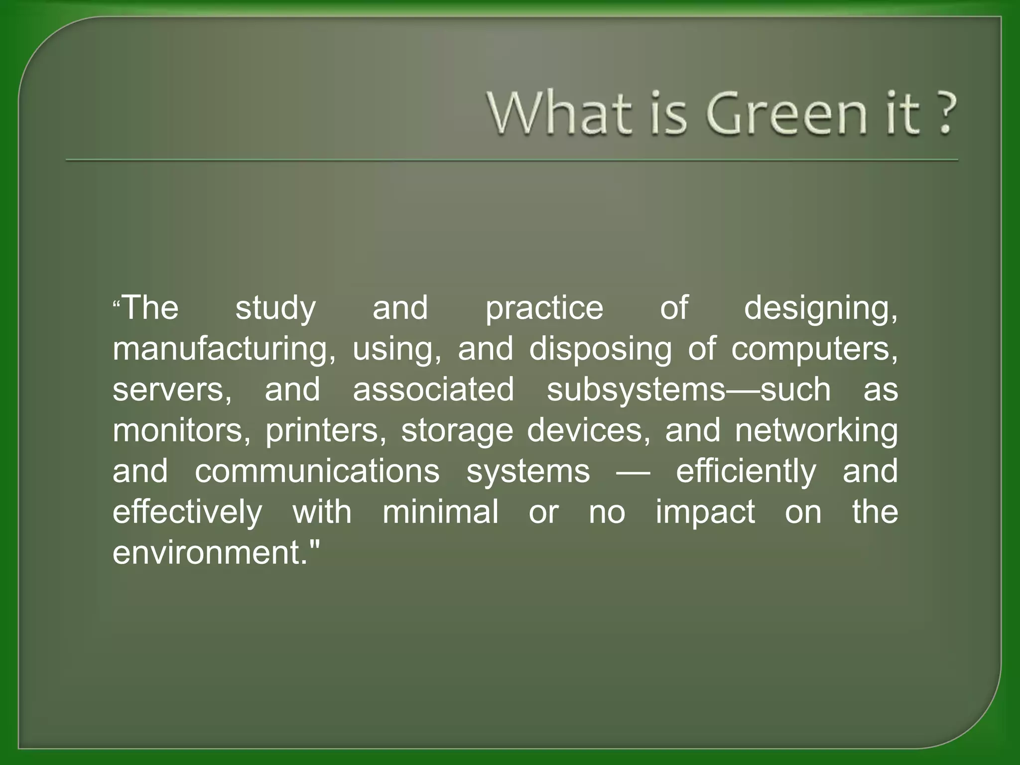 The document discusses green computing which it defines as the study and practice of designing, manufacturing, using, and disposing of computers and associated equipment efficiently and with minimal environmental impact. It provides tips for green computing such as using LCD monitors instead of CRTs, powering down peripherals when not in use, properly disposing of e-waste, measuring power usage effectiveness, managing airflow, adjusting thermostats, and using free cooling to remove heat from facilities without using chillers. Green computing saves the environment, is cost effective, reduces waste, and provides a safer environment for younger generations.