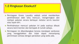 Green Laundry Enterprise adalah perniagaan dobi yang menyediakan perkhidmatan mencuci, mengeringkan dan melipat pakaian secara berbayar. Perniagaan ini pada awalnya beroperasi secara kecil-kecilan tetapi kini berkembang dengan menyediakan perkhidmatan kaunter dan layan diri serta menjual produk detergen. Green Laundry turut memberikan khidmat nasihat perniagaan berkaitan dobi dan menetapkan sasaran untuk men