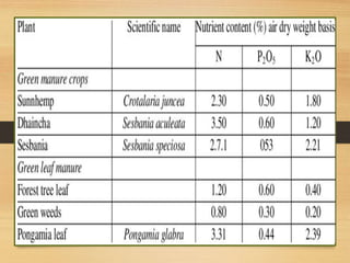 Green manuring is the practice of enriching soil fertility by plowing under or incorporating green manure crops into the soil while still green or soon after flowering. It improves soil structure and fertility by adding nutrients like nitrogen. Common green manure crops in India include dhaincha, glyricidia, and karanja, which are plowed under at the flowering stage. The benefits of green manuring include increased organic matter, improved soil structure, increased nutrient availability and crop yields. Proper timing and crop selection is important for effective green manuring.