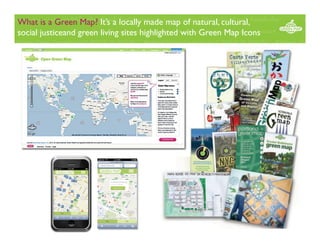 Green Map is a mapping system that highlights natural, cultural and sustainability sites within communities. Local groups create Green Maps that identify over 170 types of community assets and challenges using standardized icons. The movement began with printed maps but now includes interactive online maps. The Green Map System provides resources for mapping projects. A new Green Map Lab will be launched in New York City to address issues like climate change and youth participation through collaborative mapping projects. The Lab aims to build capacity, foster partnerships and develop models that can be replicated in other cities.