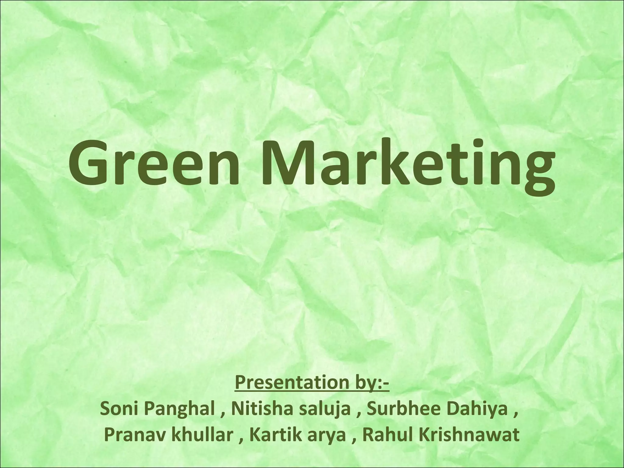 This document discusses green marketing. Green marketing refers to producing and selling environmentally friendly products. It focuses on minimizing waste and using resources sustainably. Green products are recyclable, reusable, biodegradable, and contain natural or recycled ingredients without toxic chemicals. Companies practice green marketing for opportunities for growth, social responsibility, and competitive pressures. The green marketing mix includes ecological products, higher prices, local and national distribution with eco-friendly packaging, and promotion that stresses environmental aspects. Examples given are lead-free paints, green computers that reduce e-waste, and mobile phone campaigns that save paper. The conclusion is that green marketing spreads environmental awareness while maintaining a clean, green environment through eco-friendly products.