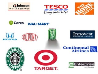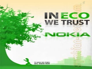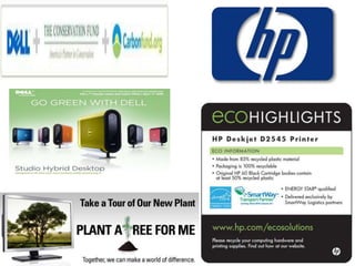 The document discusses several companies' green marketing initiatives and efforts to promote environmental sustainability. It mentions Videocon's use of green color in branding to represent its ecology efforts. It outlines Nokia, LG, Samsung, and Sony Ericsson's different focuses, such as Nokia's take-back recycling program, LG's power management, and Sony Ericsson's packaging. Apple is noted for using recyclable materials in phones. Indian companies IDEA Cellular and Aircel are promoting environmental messages through mobile advertising campaigns. Research suggests brands are not always associated with their actual green practices and consumers rely more on packaging than design for evaluations.