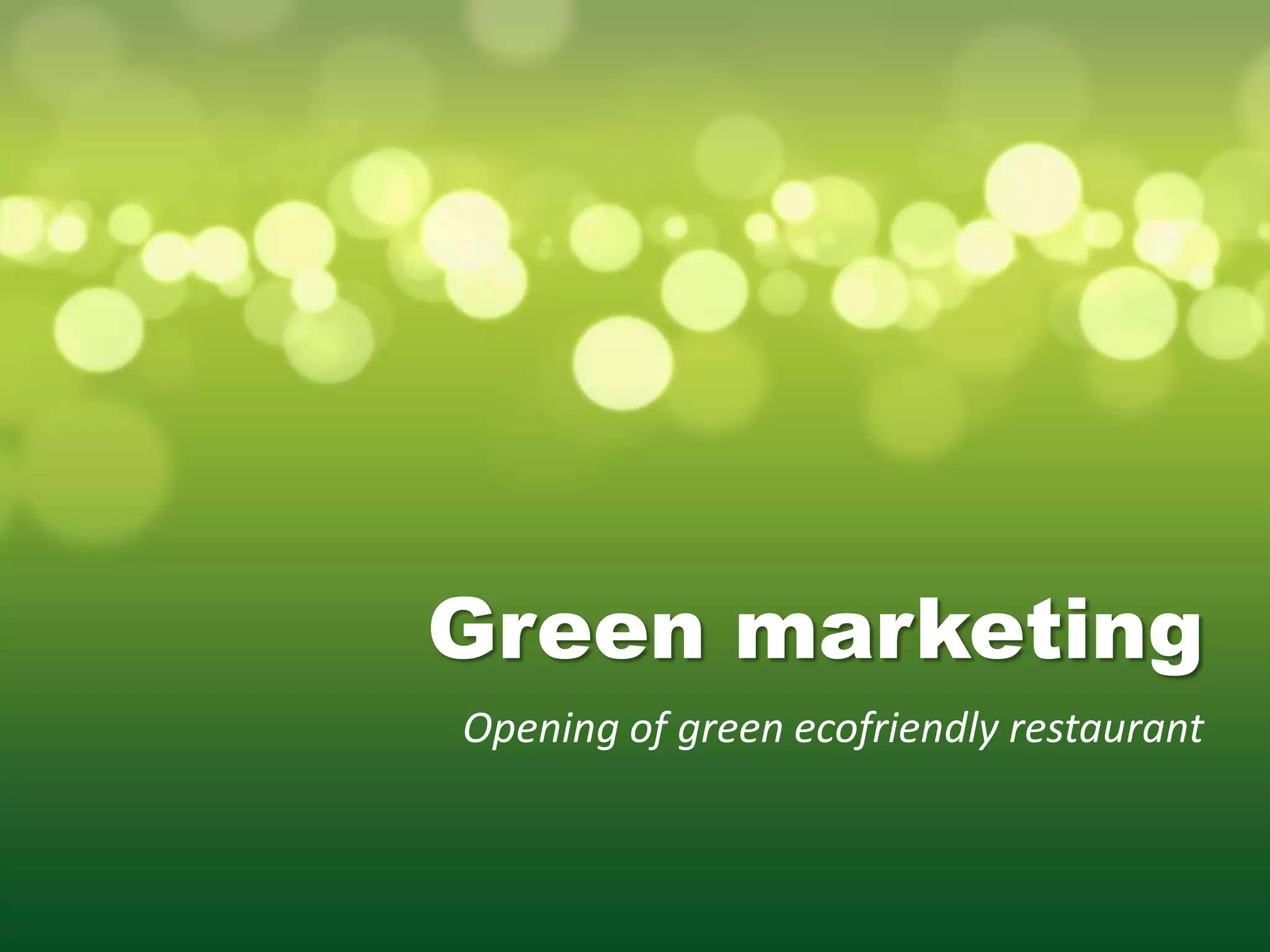 The document summarizes the opening of a new green and ecofriendly restaurant called Green Isle. It discusses the restaurant's green marketing principles of green products, pricing, placement, and promotion. Some of its ecofriendly features include using organic vegetables, biodegradable containers, CNG vehicles, solar power, and recycled materials. The restaurant aims to minimize waste and environmental impact through various sustainable practices in its supply chain, kitchen operations, and food preparation.
