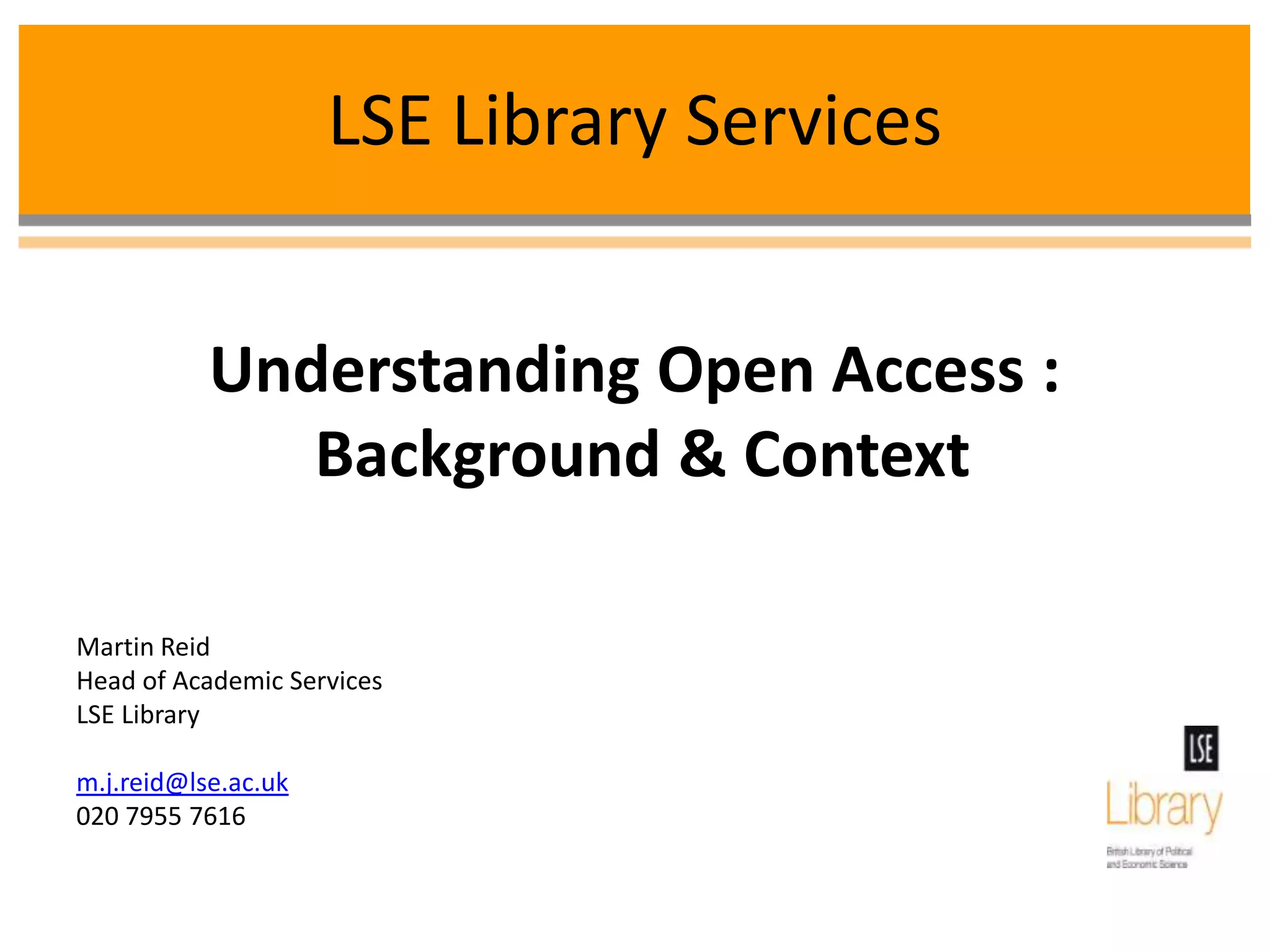 The document discusses the implications of open access for the London School of Economics (LSE), highlighting its benefits for authors, institutions, and society. It covers the two main routes to open access: gold (immediate availability via open access journals) and green (depositing work in repositories), and outlines recommendations from the Finch Report for improving access without harming the scholarly publishing industry. The LSE's strategies for increasing visibility through open access are also presented, emphasizing the use of existing tools and platforms to disseminate research effectively.