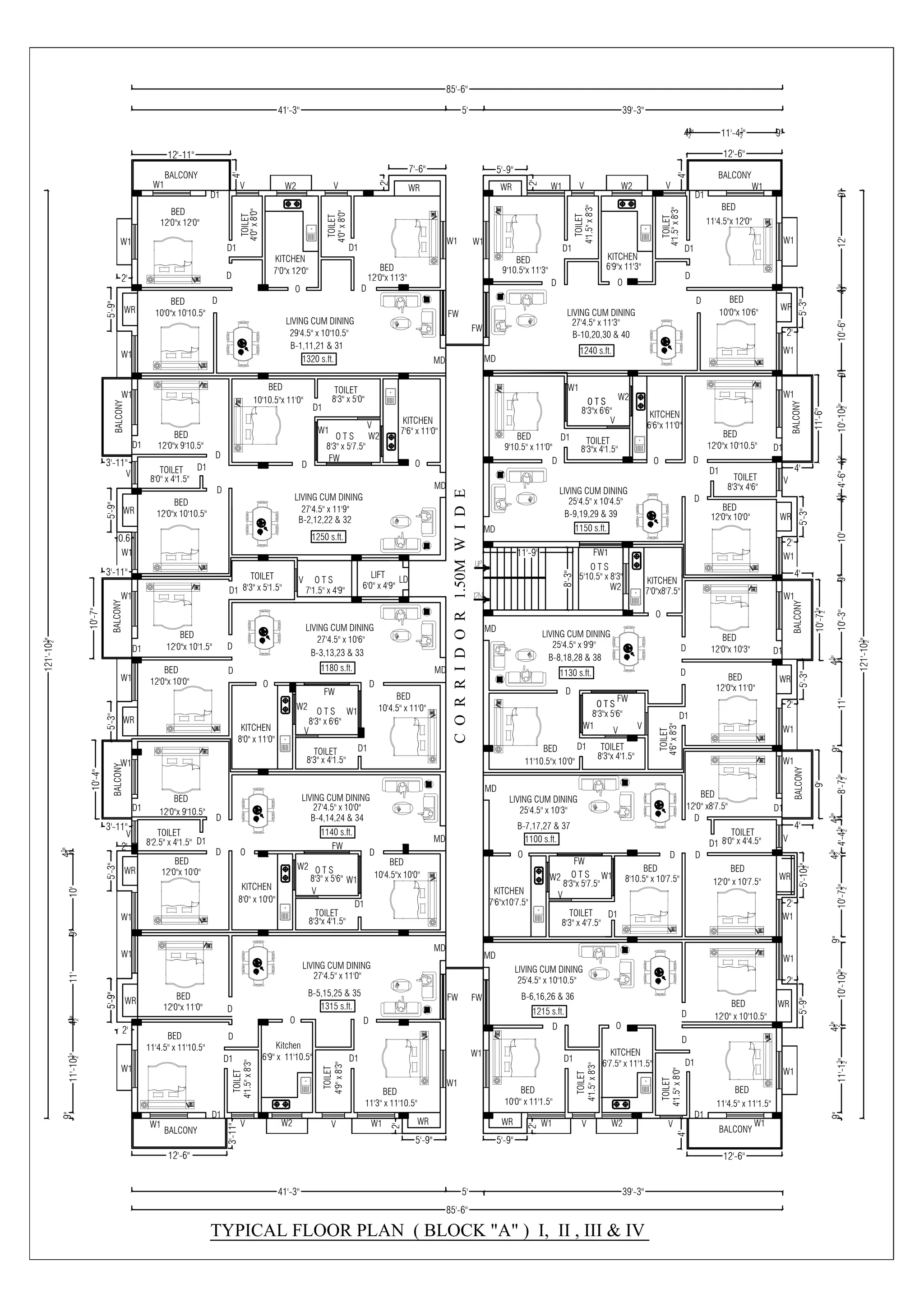 This document is a floor plan showing the layout of a typical floor (Block "A") that includes 8 residential units. Each unit includes between 1-3 bedrooms, a living/dining area, kitchen, and bathroom(s). The units range in size from approximately 1,000-1,300 square feet. The floor plan demonstrates the placement of rooms, doors, windows, and balconies within each unit and how they relate to one another.