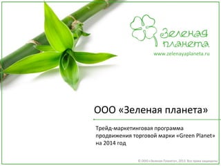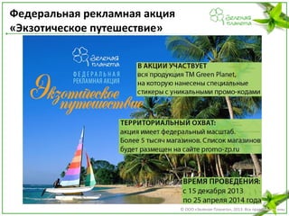 Документ описывает трейд-маркетинговую программу продвижения торговой марки «Green Planet» на 2014 год, включая федеральные рекламные акции и призы для участников. В рамках акции «Экзотическое путешествие» предлагаются различные призы, такие как матрасы, надувные бассейны и путевки. Акции проводятся в течение всего года с различными периодами и тематическими товарами.