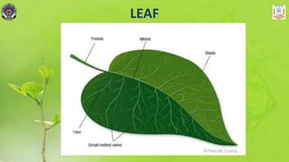 Chlorophyll in plants absorbs light energy from the sun which is used to force reactions between water and carbon dioxide, resulting in the production of sugar and oxygen. Leaves contain stomata on their undersides and act as the food factory of plants, using photosynthesis to produce sugar from sunlight, carbon dioxide, and water. Plants store extra food as starch in different parts like stems, roots, leaves, flowers, and fruits. A starch test using iodine shows the presence of starch in potato slices. An experiment without light for two days shows that leaves require light for photosynthesis to produce starch. Plants and animals are interdependent as green plants produce food and oxygen while animals produce carbon dioxide, with food chains maintaining