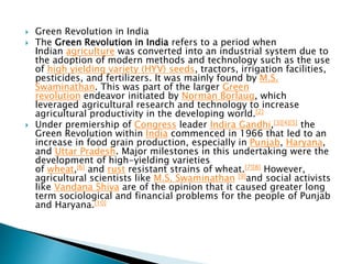The Green Revolution in India refers to the period in the 1960s-70s when agricultural productivity increased dramatically due to the adoption of new technologies and high-yielding varieties of seeds, brought about through initiatives like those of M.S. Swaminathan. This helped increase food grain production, especially in states like Punjab, Haryana, and Uttar Pradesh. However, long term problems arose due to overuse of chemicals, loss of biodiversity, rising costs for farmers, and increased regional disparities between areas that could benefit and those that could not.