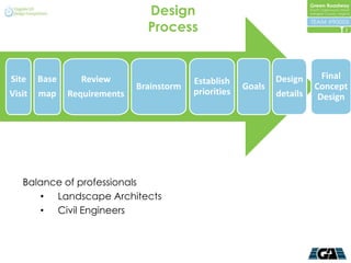 The document outlines the design process for a residential neighborhood, focusing on balancing environmental considerations with community needs. Strategies like reducing impervious areas, using pervious pavement, and integrating native landscaping are highlighted to improve stormwater management and enhance neighborhood aesthetics. The proposed plan shows a decrease in on-street parking spaces but maintains a sustainable approach with lower construction costs compared to conventional designs.