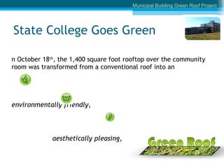 The document summarizes the municipal building green roof project in State College Borough. Workers installed a 1,400 square foot green roof over the community room to reduce building temperatures, filter pollution, reduce greenhouse gases, and stormwater runoff. Plants were established in plastic modules at a nursery before being hoisted by crane and installed in trays onto the roof. Over the next year, the green roof will be monitored and require little maintenance after the plants are established. The project received grant funding and will serve as an educational tool to encourage sustainability.