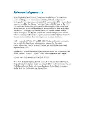 This document provides information on green roofs and their ability to reduce urban heat islands. It acknowledges that roofs make up 20-25% of land cover in major US cities, presenting opportunities for green roof installation. Green roofs work by shading roof surfaces and through evapotranspiration of vegetation, which cools the air. They come in extensive and intensive varieties. Benefits include reduced energy costs, stormwater management and increased roof lifespan, while costs have come down in recent decades. The document provides details on design considerations and gives an overview of green roof initiatives and resources for further research.