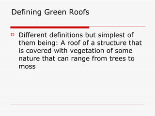 Green roofs are roofs covered with vegetation that provide insulation and environmental benefits. There are three main types - intensive, semi-intensive, and extensive. Intensive green roofs support trees and require regular maintenance, while extensive green roofs use shallow soil and low-maintenance plants. Constructing an extensive green roof involves installing a waterproof membrane, turf hooks, edging boards, and a thin layer of soil and plants.
