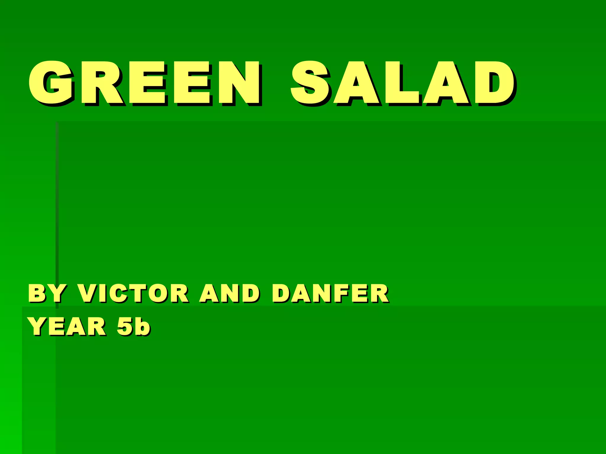 The document provides instructions for making a green salad with lettuce, cucumber, sweetcorn, and olives. It instructs the reader to slice the vegetables and place them in a bowl, then add vinegar, olive oil, and salt to dress the salad. Once dressed, the salad is ready to eat.
