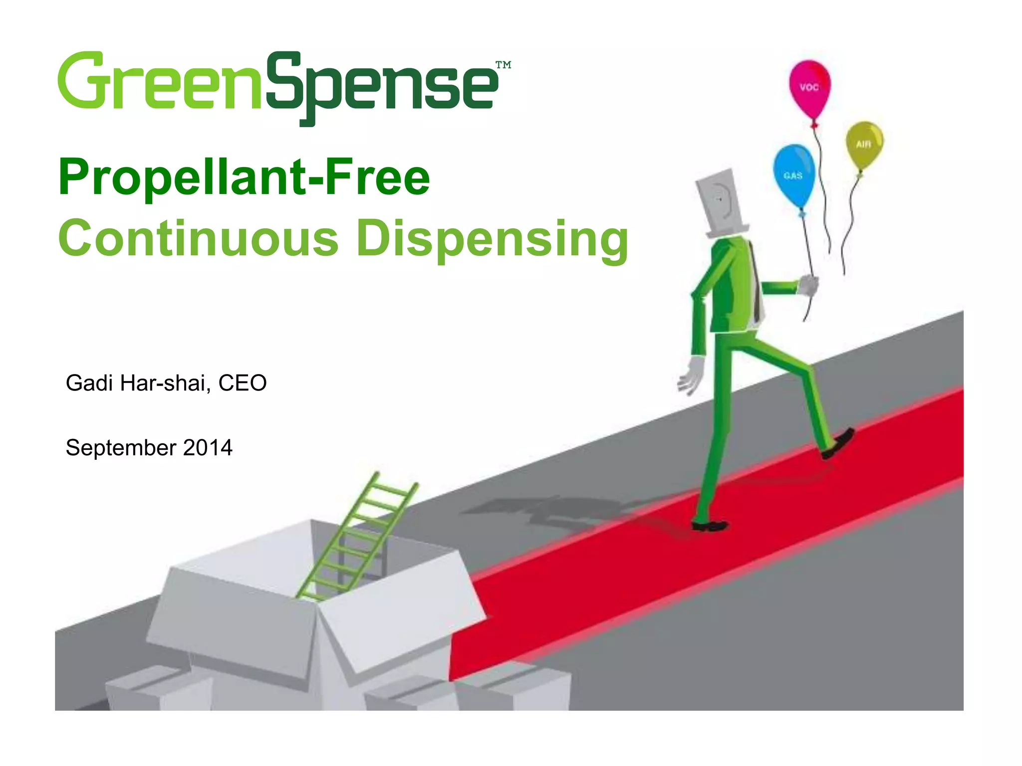 This document introduces GreenSpense, a new propellant-free continuous dispensing technology. GreenSpense aims to eliminate the drawbacks of traditional pressurized dispensing methods such as high costs, safety issues, and limited material options. It claims to be more eco-friendly by reducing greenhouse gas emissions and allowing for less preservatives. GreenSpense also aims to unleash packaging design creativity by enabling any material and shape. It is presented as reducing production and transportation costs. The technology has received recognition from cleantech competitions and the document promotes joining the "propellant-free revolution."