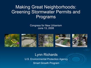 This document discusses green infrastructure and stormwater management programs and policies. It provides an overview of Lynn Richards from the EPA's Smart Growth Program speaking at the Congress for New Urbanism on June 13, 2008 about developing different standards for greenfield development and redevelopment in stormwater permits and recognizing land use strategies that directly benefit water quality. The document outlines examples of better and worse responses to stormwater management and provides details on stormwater credits and applying permits to development projects.