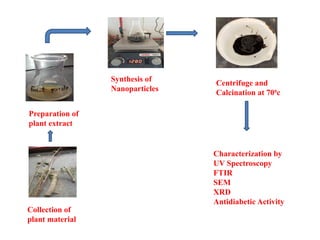 The document outlines the process of preparing plant extracts and synthesizing nanoparticles. It includes methods such as centrifugation and calcination at 700°C, as well as characterization techniques like UV spectroscopy, FTIR, SEM, and XRD. Additionally, it mentions the evaluation of antidiabetic activity of the synthesized materials.