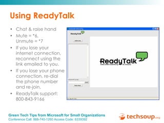 The document outlines a webinar hosted by Microsoft and TechSoup focusing on green technology tips for small organizations, including cost-saving measures through power management and resource reduction. It provides information on tools and strategies for promoting environmentally responsible practices, such as using refurbished computers, minimizing paper use, and enabling telework. Additionally, it highlights Microsoft's commitment to environmental leadership and links to further resources and support for nonprofits.