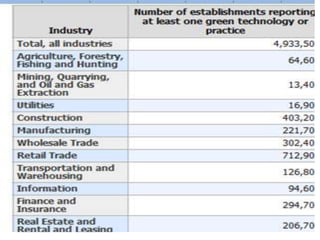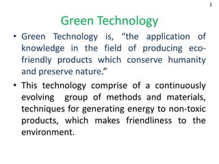 This document discusses green technology and its importance for sustainable development. It defines green technology as methods and materials that generate energy and non-toxic products in an environmentally friendly way. The objectives of green technology are sustainable development, eliminating waste, reusability, innovation, and feasibility. Key areas of green technology discussed include green chemistry, nanotechnology, buildings, IT, and energy from renewable sources like water, wind, and solar power. Major industries in India adopting green tech are also listed.