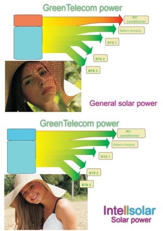 This document from Intellsolar discusses using solar power to provide energy management for telecom needs and increase profits. It describes how solar power can be used to power base transceiver stations, batteries, and air conditioners, saving up to 80% on diesel costs and increasing profits by 80%. Diagrams show how Intellsolar's solar power system works to provide thermal energy from the sun to power air conditioning units for telecom equipment shelters through a process of heat absorption and vapor generation.