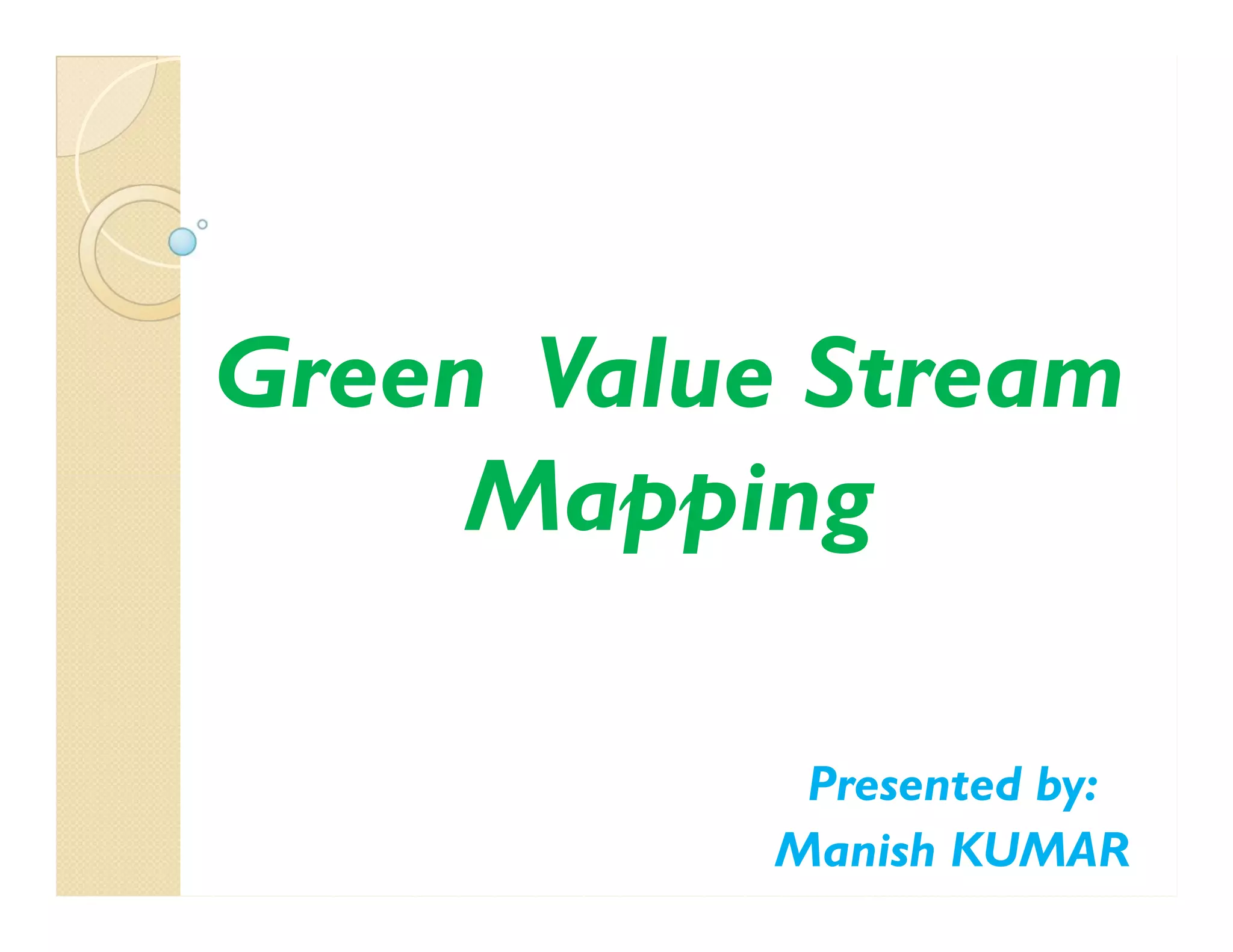 Green value stream mapping is a tool that integrates lean manufacturing principles with environmental considerations. It adds data on material and energy usage to traditional value stream maps. This allows companies to identify waste and inefficiencies in their processes in order to simultaneously reduce waste, pollution, and costs. A case study at a Volvo plant used green value stream mapping to analyze energy usage and identify opportunities to reduce unnecessary energy consumption from idling equipment and lighting/ventilation systems.