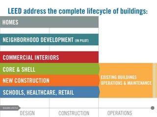 The document discusses the value and metrics of green building design, highlighting statistics on energy performance, LEED certifications, and the benefits of sustainable construction. It presents case studies that showcase energy savings and increased productivity associated with green buildings, while also addressing challenges in corporate sustainability. The content emphasizes the need for improved measurement of value and calls for greater commitment from the commercial real estate sector towards sustainability.