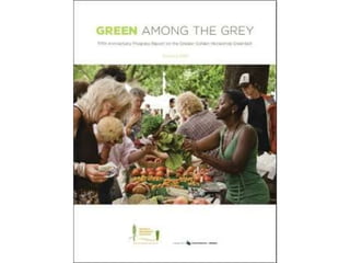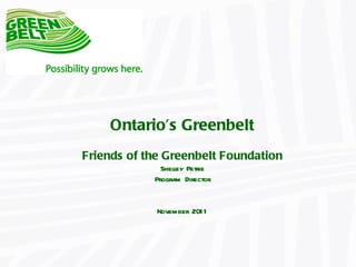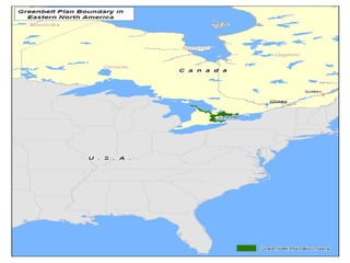 The document discusses the policies and initiatives related to Ontario's Greenbelt, highlighting its significance in protecting agricultural and natural environments while promoting sustainable urban development. It emphasizes the importance of public consultations and advocacy for expanding the Greenbelt, outlining funding sources and goals for enhancing awareness and support. The document also notes high public support for the Greenbelt as an environmental initiative and presents ideas for future improvements and initiatives.