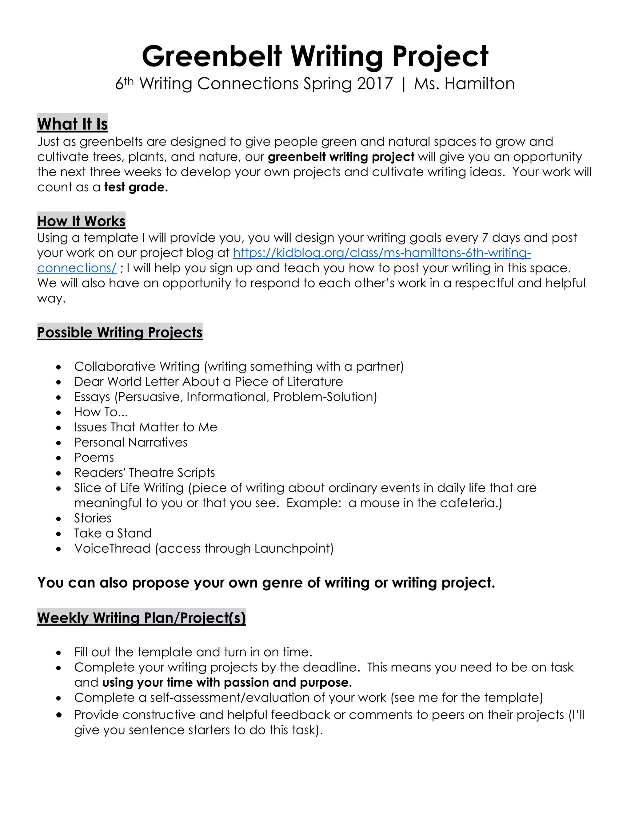 This document outlines a greenbelt writing project that will take place over three weeks. Students will design writing goals and projects on a weekly basis using a provided template. They will post their work to a class blog for feedback. Possible writing projects include collaborative writing, essays, how-to guides, personal narratives, poems, scripts, and more. Students will complete self-assessments, provide feedback to peers, and work towards developing their writing skills.