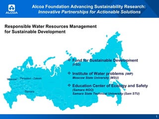 The document outlines the Alcoa Foundation's initiatives focused on sustainable water resource management in collaboration with various Russian institutions. It details the program's structure, including community engagement, sociological surveys, and educational activities aimed at improving public attitudes toward water management. The report emphasizes the need for a multi-level water management strategy and partnerships to foster sustainable development in local communities.
