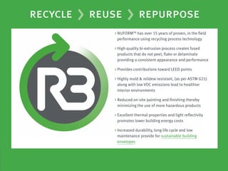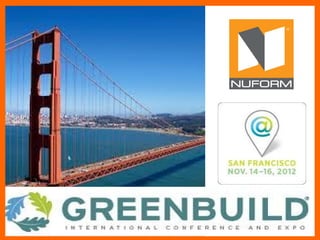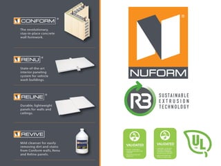 This document introduces Nuform Building Technologies' CONFORM insulated concrete form system. CONFORM allows builders to construct durable, energy efficient concrete walls that are corrosion resistant and require minimal maintenance. The precut forms interconnect on site for quick assembly. CONFORM walls can be solid concrete or insulated. Insulated walls provide better thermal efficiency and moisture protection than traditional construction. Various commercial and residential projects around the world have used CONFORM to withstand hurricanes and tropical conditions.