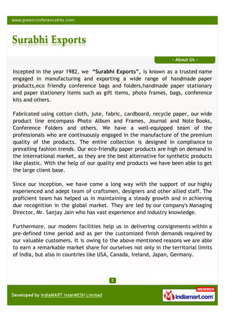 Surabhi Exports, established in 1982, specializes in manufacturing and exporting a diverse range of eco-friendly products including conference bags, folders, and handmade paper items. The company emphasizes high-quality craftsmanship and modern production facilities, allowing them to cater to an international clientele. With a dedicated team led by Mr. Sanjay Jain, they have gained significant market recognition in regions such as the USA, Canada, and Europe.