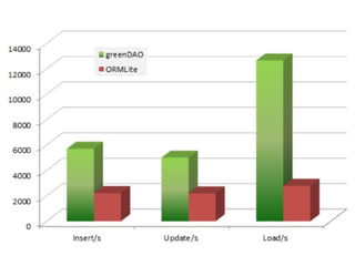GreenDAO is an ORM (Object Relational Mapping) library that uses code generation to provide a faster alternative to reflection-based ORMs for Android. It works by mapping Java objects to SQLite database tables to allow for CRUD (create, read, update, delete) operations on the data. The library includes a schema definition and code generator that automatically generates DAO classes to manage database access and queries. This avoids the performance overhead of reflection and allows for compiler checks of the database schema.
