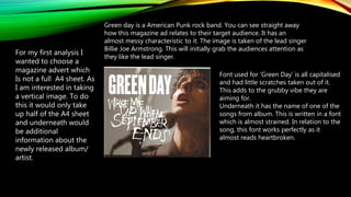 (1) The magazine advertisement analyzes features an image of Green Day lead singer Billie Joe Armstrong to grab attention of their target punk rock audience. (2) The font used for "Green Day" has scratches to add a grubby vibe, while the song title font looks almost heartbroken to relate to the song. (3) Dark black and grey colors were chosen to represent the punk rock vibe and stereotypes, making Armstrong's black hair and makeup stand out against the gloomy image.