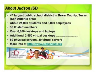Judson ISD implemented several green computing initiatives to reduce their environmental impact and energy costs, including virtualizing servers, deploying desktop virtualization with nComputing X-Series devices, purchasing more energy efficient computers and monitors, automating computer shutdowns, and establishing equipment recycling programs. This allowed them to reduce acquisition costs by 50%, lower annual energy costs per computing seat from $29.78 to $7.44, and save over $155,000 per year through automated shutdowns alone.