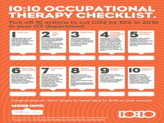 The document discusses making healthcare more environmentally sustainable. It notes that climate change causes significant harm and economic losses worldwide. The document calls for occupational therapists to help make the NHS carbon footprint smaller by using more sustainable transportation, virtual meetings, and electronic records. Occupational therapists are also encouraged to support service users in environmentally-friendly activities like community gardening, composting, recycling, and using more sustainable modes of transportation.