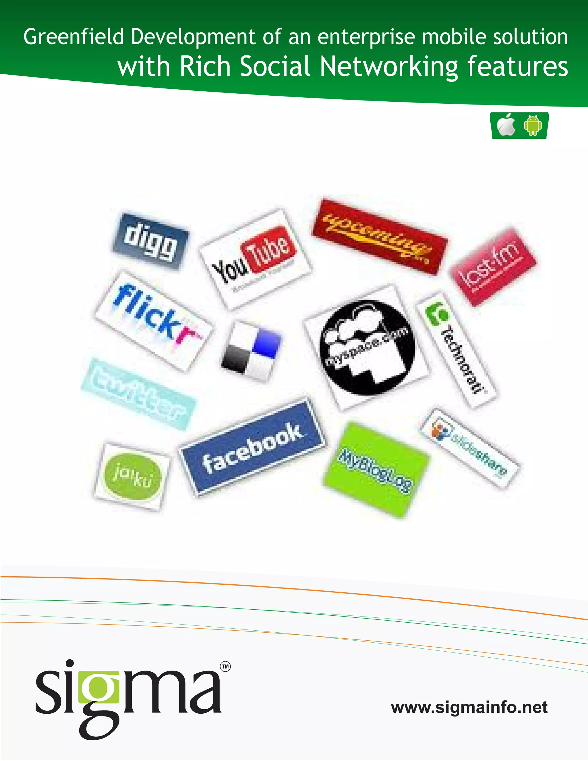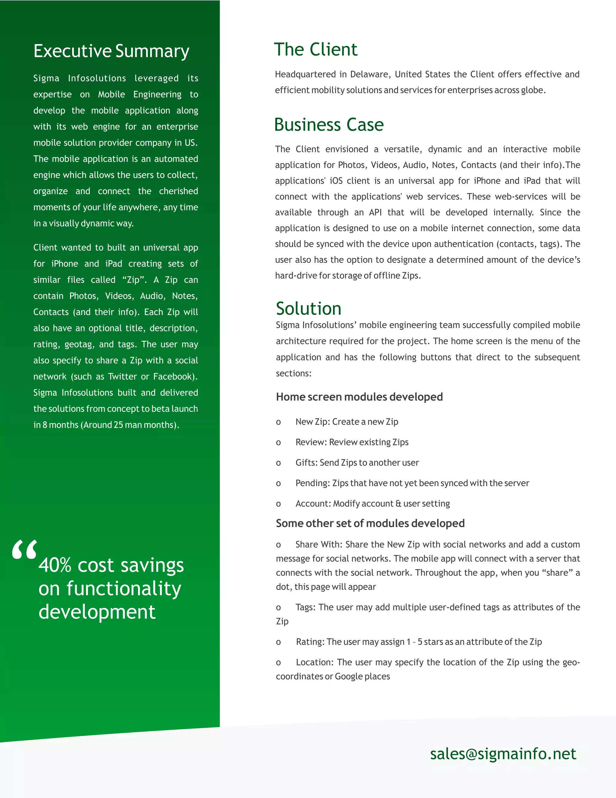 Sigma Infosolutions developed a mobile application for an enterprise client that allows users to collect, organize, and share photos, videos, audio notes, and contacts. The app includes features like creating "Zips" of multimedia content that can be shared on social networks. Sigma designed the mobile architecture and front-end screens for both iOS and Android. They leveraged agile methodologies to deliver the beta version within 8 months, meeting business objectives of reduced costs and high availability.