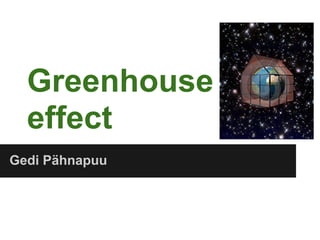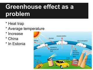 The document discusses the greenhouse effect and global warming as problems caused by human activities like deforestation and burning fossil fuels which release greenhouse gases and trap heat. It notes the greenhouse effect increases average temperatures and mentions solutions like going green, planting more trees, and reducing fossil fuel use. The consequences of the greenhouse effect and global warming include more extreme weather, rising sea levels, and effects on ice, snow, and drought. It concludes by calling for protecting the environment.