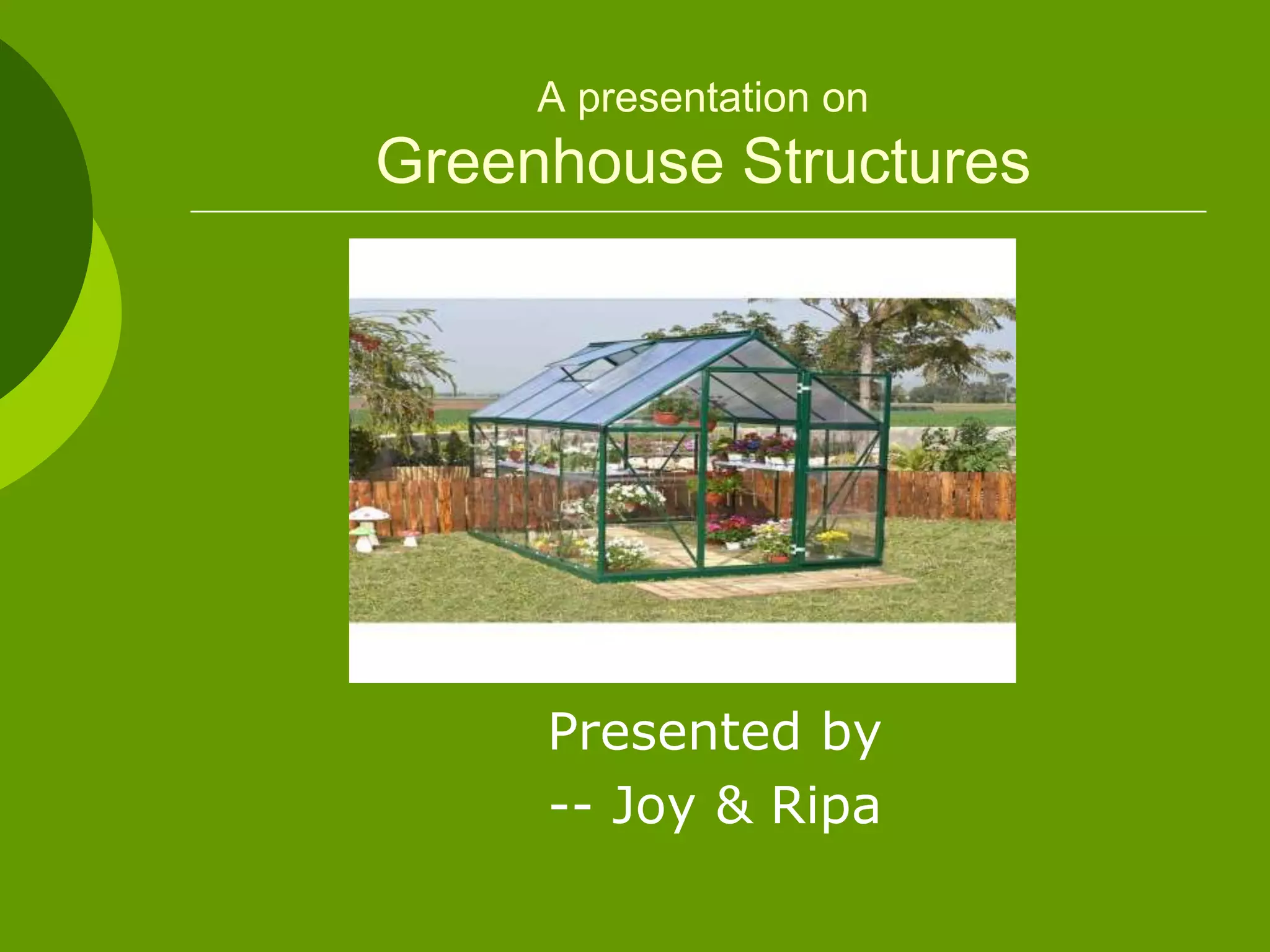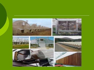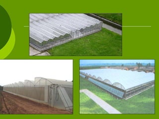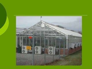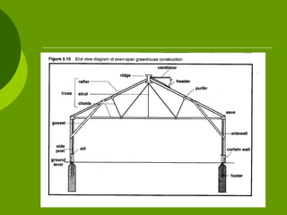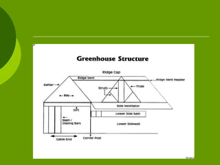 The document outlines various aspects of greenhouse structures, including their types, benefits, and components. It discusses attached and freestanding greenhouses, detailing their advantages and disadvantages, as well as different covering materials like glass, polycarbonate, and polyethylene. Additionally, it covers heating and cooling systems, ventilation methods, and environmental considerations for optimal plant growth.
