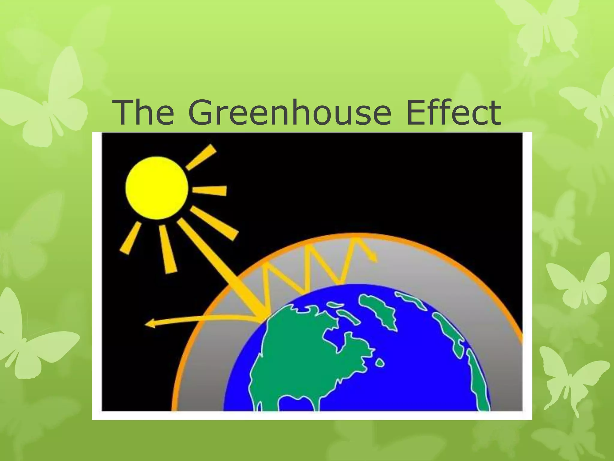The greenhouse effect describes how greenhouse gases like carbon dioxide, methane, and nitrous oxide trap heat in the lower atmosphere, keeping the global average temperature about 60°F warmer than it would otherwise be. Without this natural greenhouse effect, the earth's temperature would be about -18°C. However, human activities that release additional greenhouse gases like burning fossil fuels are enhancing the greenhouse effect and causing global warming, with potential consequences including rising sea levels, changes in weather patterns, and difficulties for plants and animals.