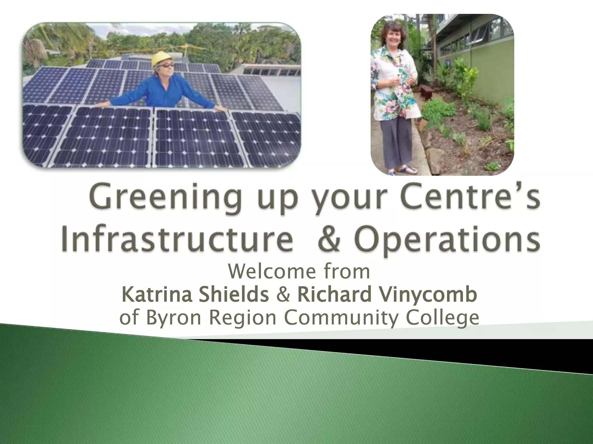 The document discusses strategies for improving environmental sustainability in the Byron Region Community College's infrastructure and operations. It highlights the urgent need for reducing greenhouse gas emissions, waste production, and energy consumption in Australia, along with specific actionable measures such as enhancing energy efficiency, promoting recycling, and sourcing greener products. Additionally, it encourages collaboration, behavior change, and community engagement in creating a more sustainable future.