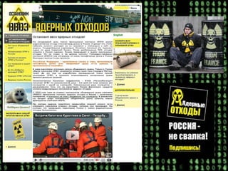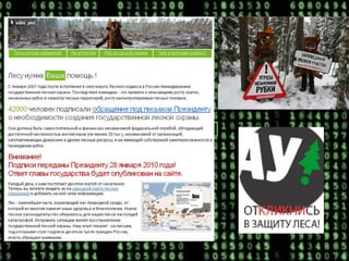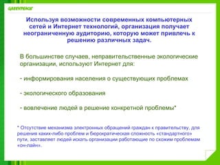 Документ описывает участие киберактивистов в решении экологических проблем через интернет и современные технологии, позволяя организовать массовое привлечение к решению задач. Неправительственные организации используют интернет для информирования и вовлечения граждан, несмотря на бюрократические сложности. К кампании подключилось 1350 киберактивистов, собравших 45000 подписей и значительно привлеченных к процессу обсуждения экологических вопросов.