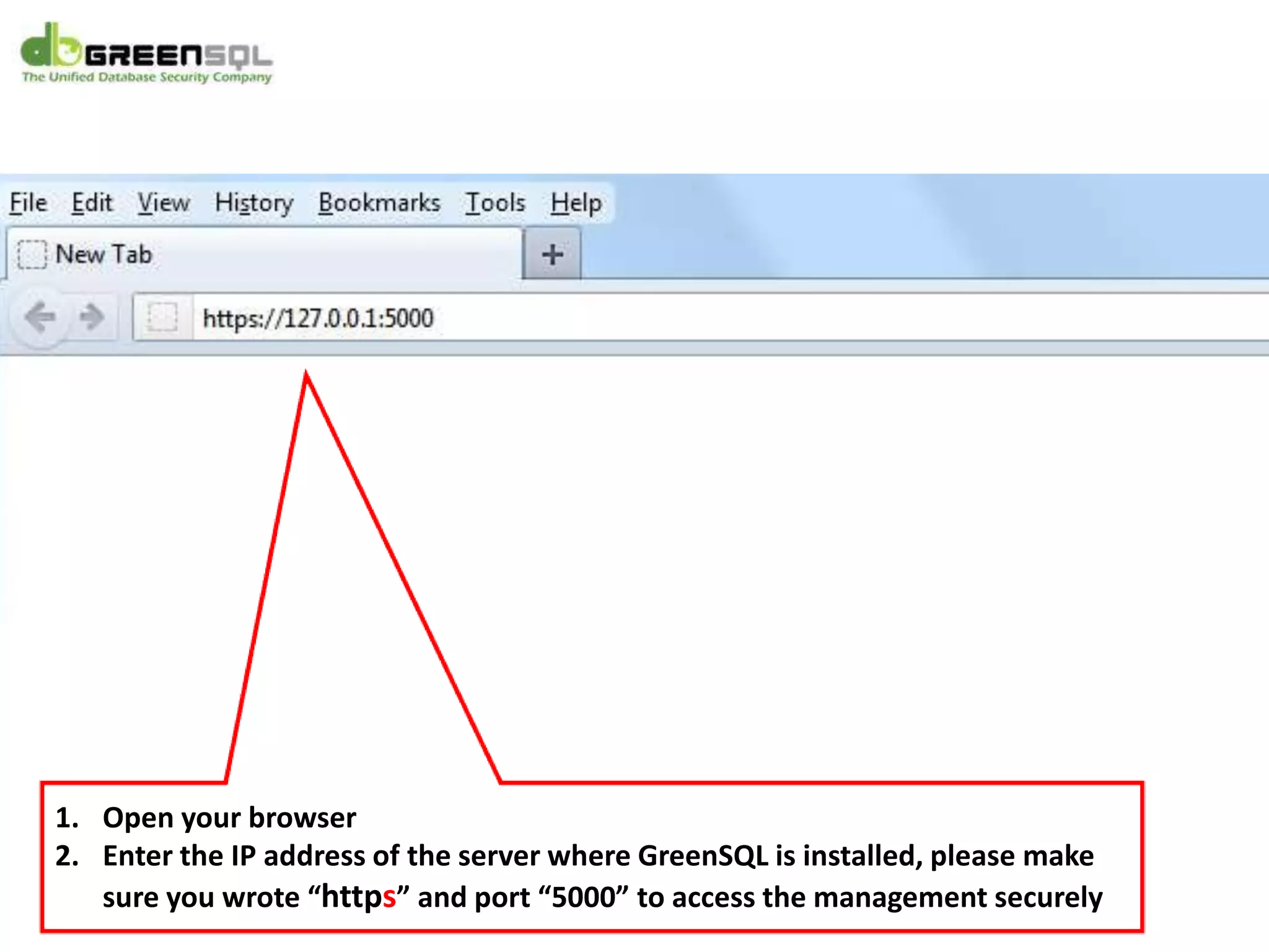1. The document provides step-by-step instructions for connecting to a GreenSQL server for the first time and completing the initial configuration.