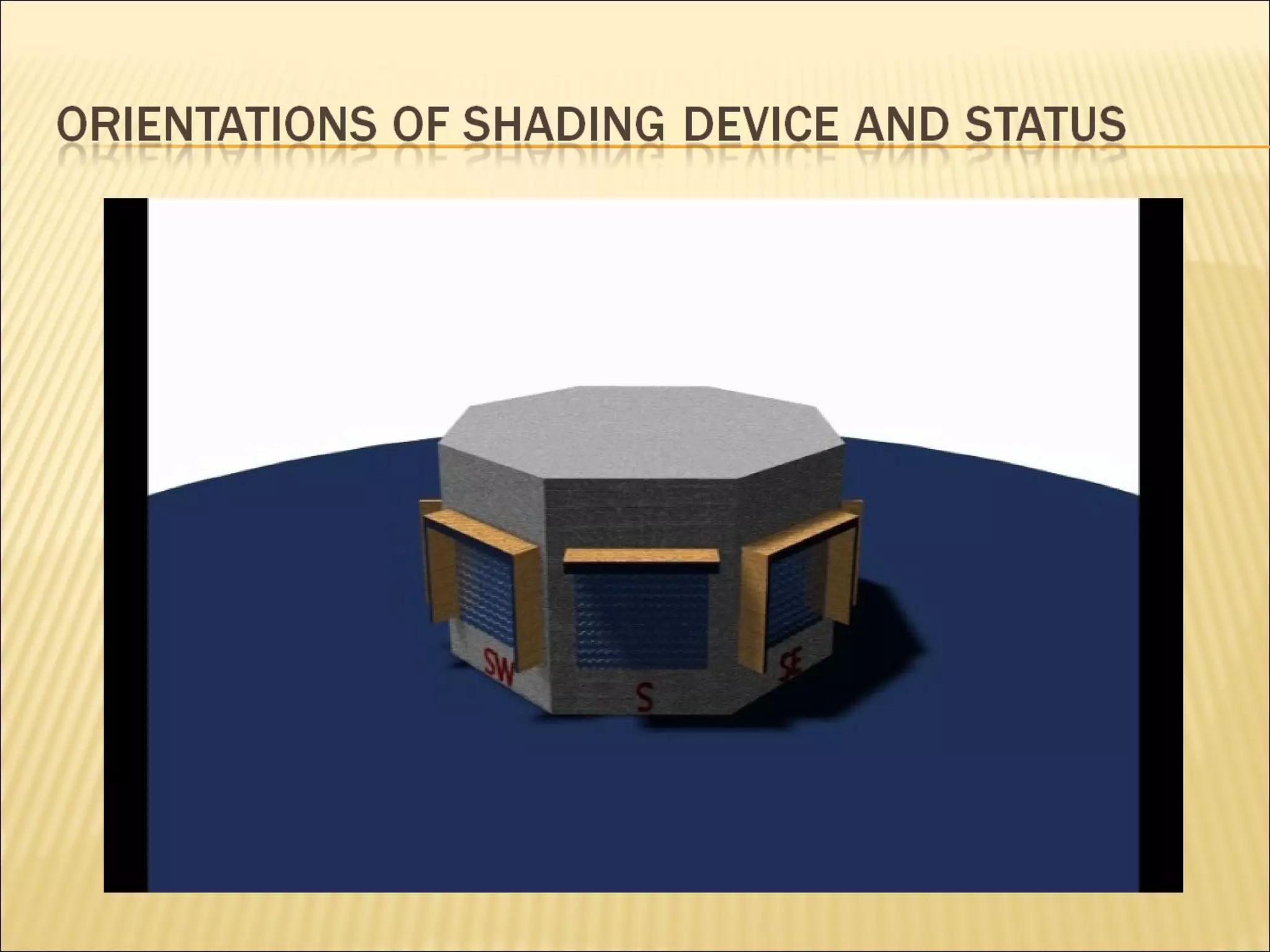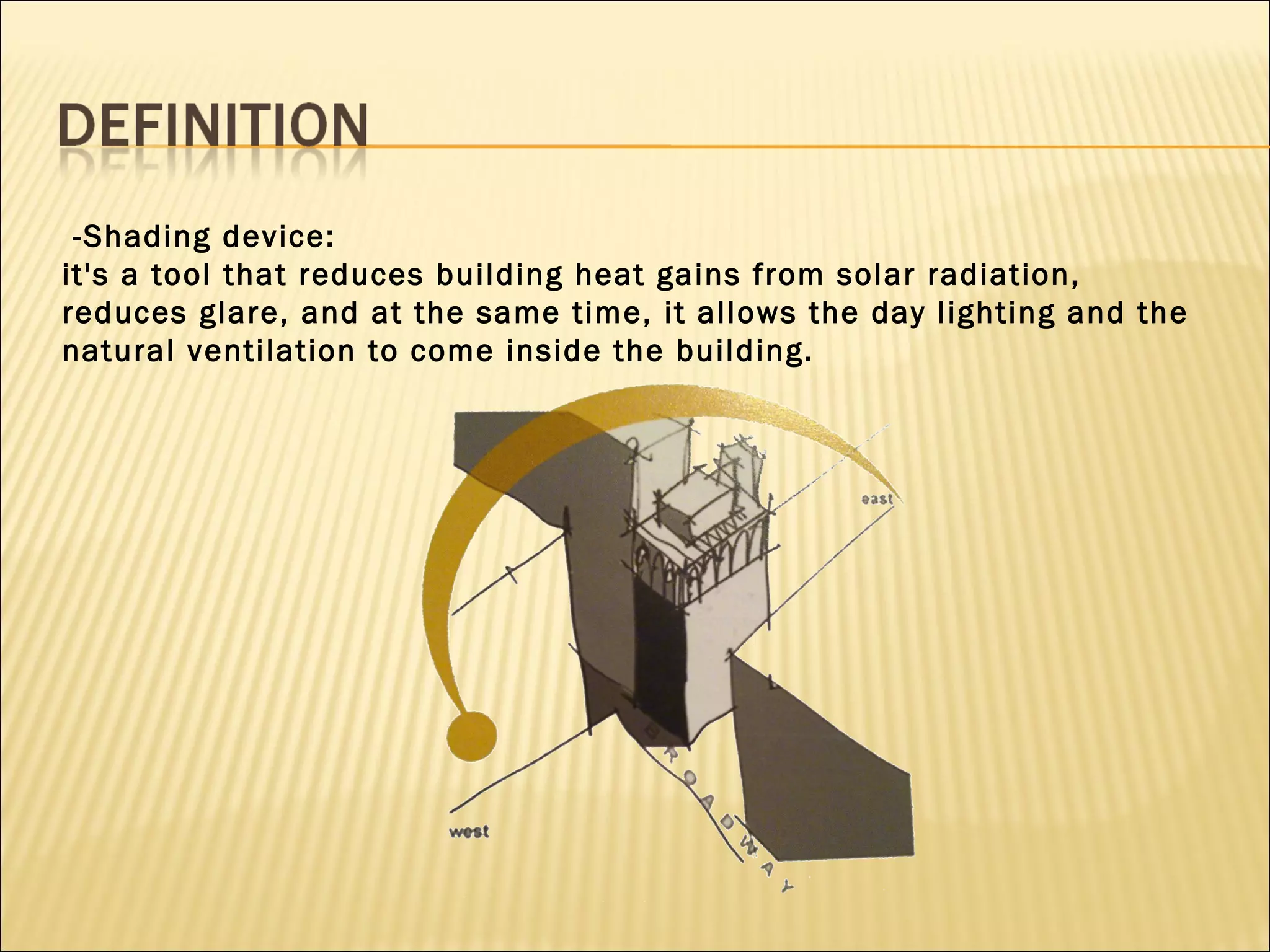 Shading devices reduce solar heat gain and glare while allowing daylight and ventilation. There are fixed, movable, and plant-based shading devices. External shading devices provide more protection from solar radiation than internal shading devices. Properly designing and placing shading devices based on sun path, orientation, and views can help reduce cooling loads in buildings.