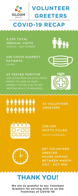 Between March and September, a medical clinic saw 5,250 total patient visits, with 230 patients suspected to have COVID-19, though many potential cases were not tested during the first part of that period due to testing restrictions. From March 21st to October 3rd, 54 volunteer greeters contributed 687 hours over 239 shifts to screen patients, filling 93.7% of needed shifts. The greeters played a key role in the clinic's COVID-19 response efforts.