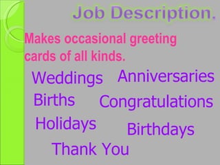 The document discusses the career of being a greeting card designer. It describes the types of cards designed, including for occasions like weddings, births, holidays. It requires creativity and artistic abilities like drawing or photography. Salaries can vary depending on the number of cards sold in stores. While the work is enjoyable for some, the author feels they do not have strong enough art skills and the variable income would not make it a good career choice for them personally.